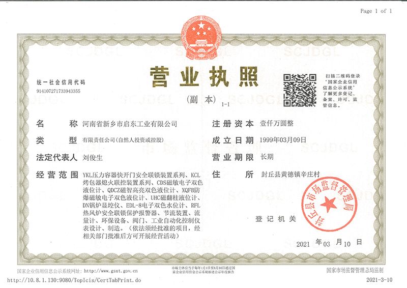 河南省新鄉(xiāng)市啟東工業(yè)有限公司始建于1987年,是專注研發(fā)、生產(chǎn)自動化儀器儀表(主要與壓力容器、鍋爐等容器配套使用)的廠家。主要產(chǎn)品有液位計(磁敏雙色型、磁翻柱型等)系列、烤包器熄火聯(lián)控裝置系列、壓力容器快開門安全聯(lián)鎖保護裝置系列、鍋爐報警器系列。二十多年來,公司產(chǎn)品暢銷國內(nèi)并遠銷俄羅斯、蒙古與東南亞,深得廣大用戶的信賴和好評。我們多年來致力于自動化儀器儀表的研制生產(chǎn),公司現(xiàn)具有完善的生產(chǎn)、試驗、檢測手段和設備??萍紕?chuàng)新、誠信服務,是我們不變的經(jīng)營理念,我們將以強有力的技術(shù)支持及售后竭誠為客戶提供良好的服務?! ?012年我公司成功研發(fā)了KCL系列烤包器熄火聯(lián)控裝置,并于2013年2月2日榮獲中華人民共和國國家知識產(chǎn)權(quán)局辦法的《實用新型**證書》<**號:2021202257735>該產(chǎn)品廣泛應用于唐鋼等大型鋼鐵企業(yè),為烤包器安全作業(yè)提供了有力的保障。  2002年我公司成功研發(fā)磁敏電子雙色液位計獨特的高亮度LED紅綠雙色顯示,獲得了專家的首肯和用戶的一致好評。在此基礎上我公司研發(fā)人員十年磨一劍,致力于XQFB-1防爆型磁敏雙色液位計的研發(fā),于2013年12月27日由國家防爆電器產(chǎn)品質(zhì)量監(jiān)督檢驗中心檢驗合格并頒發(fā)防爆合格證書<編號:cnex19.0883>。該產(chǎn)品性能得到了充分的發(fā)揮,廣泛應用于含有Ⅱ類A·B級T1-T4組可燃氣體或蒸汽與空氣混合形成的爆炸性混合物的0區(qū)、1區(qū)危險場所。連接用戶DCS或PLC系統(tǒng)實現(xiàn)遠距離集中顯示和控制,從而實現(xiàn)節(jié)能、數(shù)字化管理。為用戶增加了一定的經(jīng)濟效益和社會效益,。2014年公司成功申請了夢潤儀表的logo,新的品牌新的形象,夢潤儀表是啟東的LOGO, 歡迎新老用戶前來洽談合作?! ∥覀円蝗缂韧刈⒅乜蒲械耐度?,憑借產(chǎn)品的不斷更新、加大科技含量,進一步拓展市場。我們相信品質(zhì)成就未來,以過硬質(zhì)量、優(yōu)惠價格、完善的售后服務熱忱歡迎廣大客戶來我司視察指導、洽談業(yè)務;精誠合作,共創(chuàng)輝煌!